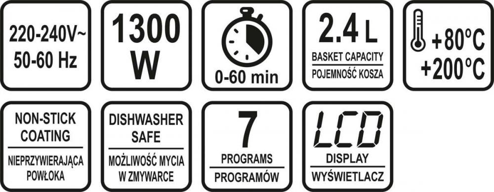 Wielofunkcyjna frytkownica beztłuszczowa, która nie tylko smaży, ale także odmraża, podgrzewa, piecze i grilluje. Frytownica polecana do przygotowania frytek, mięsa, ryb, warzyw, ciastek.