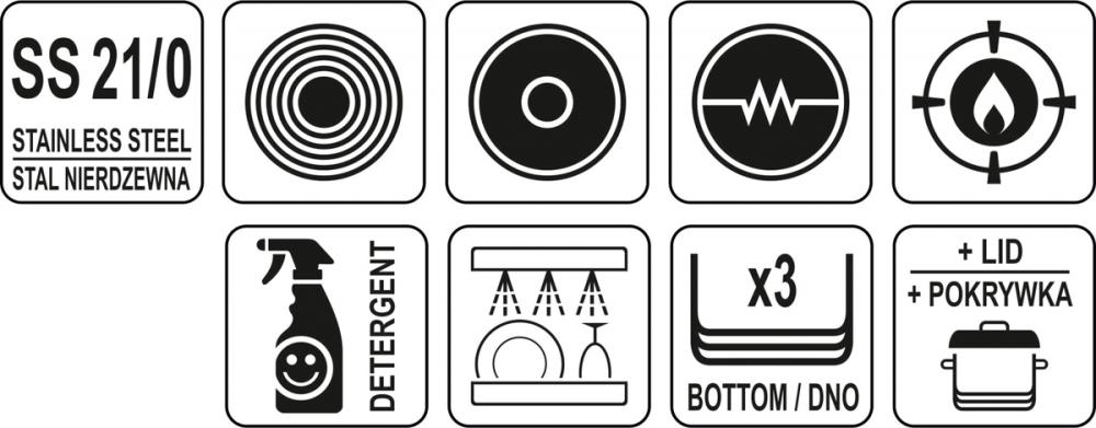 Wkładka ferromagnetyczna w dnie pozwala na stosowanie garnków YATO na każdym rodzaju kuchenek, takich jak: - elektryczna - indukcyjna - gazowa - ceramiczna