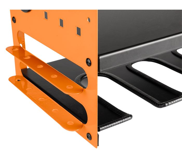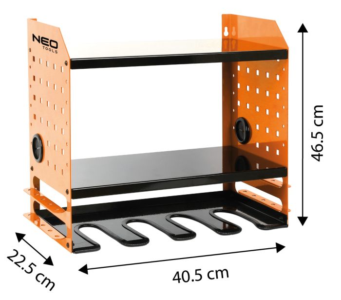 Półka na elektronarzędzia akumulatorowe? 84-199 NEO TOOLS to solidne i funkcjonalne rozwiązanie do przechowywania oraz organizacji narzędzi w warsztacie. Wykonana z wytrzymałej, stalowej blachy o grubości 1,5 mm, pokryta trwałym malowaniem proszkowym, półka NEO TOOLS gwarantuje długą żywotność i odporność na uszkodzenia. Dzięki perforacji 10 x 10 mm oraz otworom w bocznych ściankach (fi 38 mm) z gumowymi zaślepkami, umożliwia wygodne przeprowadzenie przewodów elektrycznych. Wyposażona w ogumowane uchwyty, pozwala na zawieszenie do 5 elektronarzędzi, a jej maksymalny udźwig to 20 kg. Dodatkowe otwory ułatwiają montaż, a całość cechuje się wysoką jakością wykonania, bez ostrych krawędzi. Półka marki NEO TOOLS idealnie nadaje się również do przechowywania innych narzędzi, jak np. młotki, i jest dostępna w nowoczesnej kolorystyce: z pomarańczowymi bocznymi ściankami oraz czarnymi półkami i wieszakami.