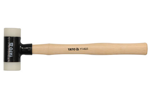 Materiał głowicy blacha,tworzywo ,śrut stalowyOpis: Młotek o specyficznej budowie, główka bijaka metalowa fi 40 mm , zakończona z obu stron okrągłymi, odpornymi na uszkodzenia mechaniczne, nakładkami z tworzywa. Obuch wypełniony w połowie objętości metalowym śrutem, który przemieszczając się swobodnie, swą bezwładnością likwiduje efekt odbicia młotka od materiału, kierując całą siłę uderzenia w jego kierunku. Równocześnie zapobiega negatywnym efektom odbicia młotka od materiału. Osadzony na drewnianym, jesionowym, lakierowanym trzonku o długości 335 mm.PrzeznaczenieSpecjalistyczny młotek montażowy do prac wymagających silnego uderzania i równoczesnej ochrony materiału np. do montażu części maszyn i urządzeń lub dobijania poziomującego układane płytki ceramiczne. Wyczuwalny brak odbicia młotka od materiału.