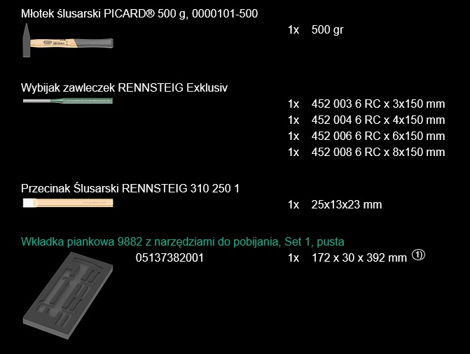 Wytrzymała wkładka piankowa dwukolorowa, umożliwiająca szybką identyfikację brakujących elementów pasuje do wózka warsztatowego Tool Rebel wyposażona w młotek ślusarski PICARD®, 4 wybijaki zawleczek RENNSTEIG i przecinak ślusarski RENNSTEIG.