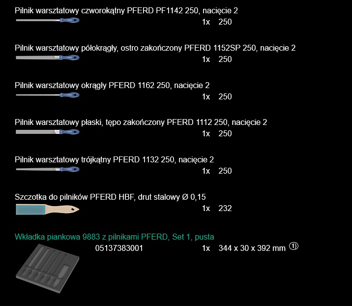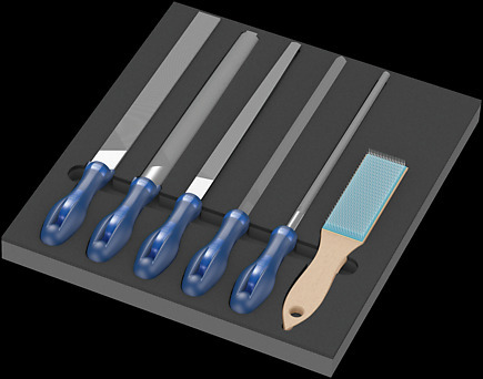 Wytrzymała wkładka piankowa dwukolorowa, umożliwiająca szybką identyfikację brakujących elementów pasuje do wózka warsztatowego Tool Rebel wyposażona w 5 pilników warsztatowych i szczotkę do pilników firmy PFERD.