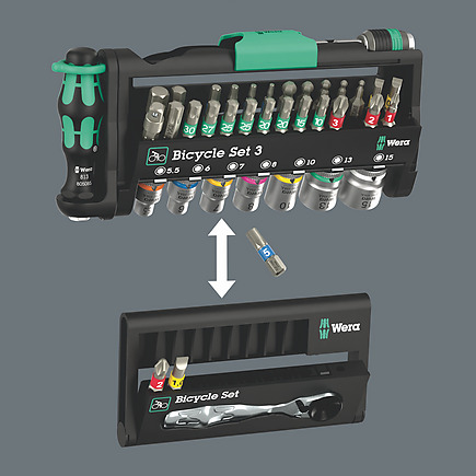Zestaw narzędzi do naprawy rowerów złożony z grzechotki, bitów, kluczy nasadowych i rękojeści z uchwytem do bitów w niezwykle kompaktowej kasecie Tool-Check. Idealny do różnorodnych zastosowań w każdej sytuacji. Wysokiej jakości rękojeść Kraftform z uchwytem do bitów, która zapewnia przyjemną i ergonomiczną pracę chroniąc dłoń przed powstawaniem pęcherzy i odcisków. Twarde strefy chwytu umożliwiają szybkie pokręcanie, miękkie strefy zapewniają przenoszenie wysokich momentów obrotowych. Grzechotka do szybkiego pokręcania w przypadku, gdy ze względu na ograniczoną ilość miejsca nie jest możliwe zastosowanie wkrętarki lub standardowych narzędzi ręcznych. Szybka zmiana kierunku pracy prawo-lewo przy pomocy przełącznika. Radełkowana główka grzechotki pozwala na szybkie pokręcanie kciukiem. Prosta obsługa nawet jedną ręką. Ergonomiczna konstrukcja główki i przełącznika dźwigniowego: geometria Kraftform z idealnie ukształtowanymi powierzchniami przylegania dla palców. Bezpośrednie mocowanie bitów w główce grzechotki