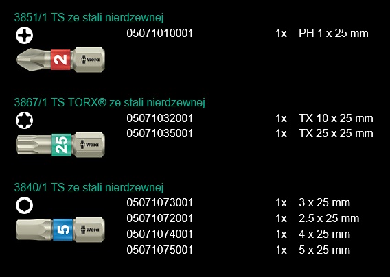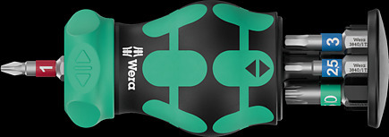 Bardzo mała rękojeść z bardzo krótkim uchwytem do bitów idealnie nadaje się do trudno dostępnych miejsc. Drobnozębna grzechotka zintegrowana z rękojeścią zapewnia szybką pracę. Intuicyjne przełączanie: przełączenie w prawo powoduje zmianę kierunku pracy na dokręcanie w prawo, przełączenie w lewo powoduje zmianę kierunku pracy na dokręcanie w lewo. Mechanizm zapadkowy można zablokować w pozycji 0 dla zapewnienia precyzyjnej pracy. Mechanizm zapadkowy można zablokować w pozycji 0 dla zapewnienia precyzyjnej pracy. Zawiera 7 bitów ze stali nierdzewnej, z których 6 znajduje się w magazynku w rękojeści, a 1 w uchwycie do bitów. System wyszukiwania narzędzi Take it easy: z oznaczeniem kolorystycznym profilu i rozmiaru ułatwiającym znalezienie odpowiedniego bitu. Silny magnes stały w uchwycie na bity zapewnia ich niezawodne mocowanie. 2-komponentowa rękojeść Kraftform z praktyczną kombinacją strefy twardej i miękkiej umożliwia pewny chwyt i precyzyjną pracę.