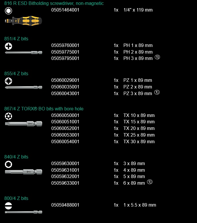 Narzędzie zabezpieczone przed ładunkami elektrostatycznymi. 16 końcówek. Z dwoma wielokomponentowymi rękojeściami 816 R ESD do szybkiego i ergonomicznego montażu. Ochrona przed ładunkami elektrostatycznymi i związanymi z nimi uszkodzeniami. Kompaktowy zestaw do pracy ręcznej i mechanicznej. Łatwe uporządkowanie według profili i wielkości. Bezproblemowe wyjmowanie i wkładanie końcówek. Z uchwytem do mocowania na pasku