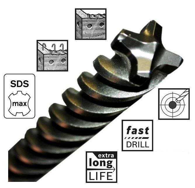 Wiertło udarowe SDS max-8X używane nawet w najbardziej wymagających zastosowaniach ma o 50% większą trwałość.
